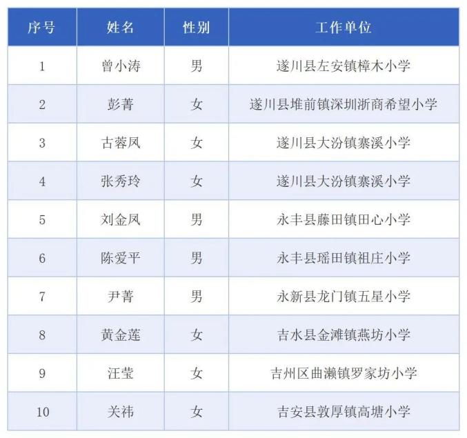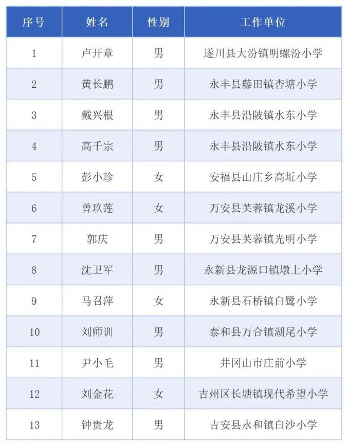 根据市人力资源和社会保障局、市财政局、市教育体育局《关于确定吉安市2024年农村教师职称特殊岗位工资的通知》精神,经个人申报、单位审核、县市两级教育、人力资源和社会保障部门批准,拟确定卢开章等13名农村教师享受中小学高级教师七级岗位工资,曾小涛等10名农村教师享受中小学一级教师十级岗位工资,现予以公示。如果对这类人员有异议,请于2024年12月10日前向市教体局人事科反映。