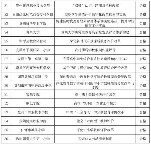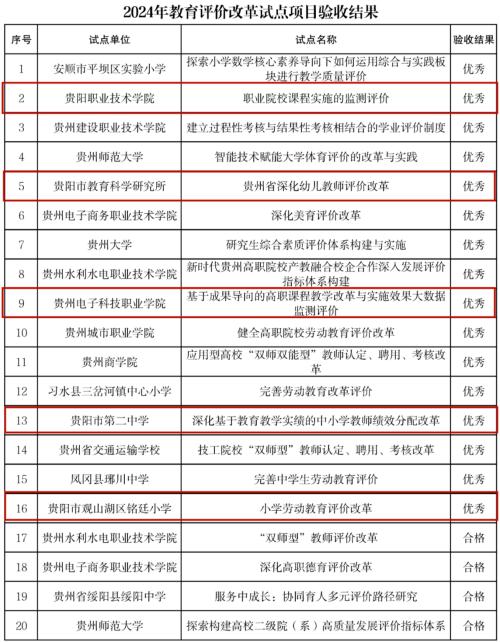按照《省教育厅办公室关于发展的信息》进行。 2024 近日,贵州省教育厅组织了《关于年度教育评估改革试点项目验收的通知》,对今年申请完成的教育评估改革试点项目进行了验收。经单位现场阐述、专家评审,拟评定“优秀”等次。 16 个、“合格”等级 20 个,现在公布结果。公示时间为:2024 年 12 月 2 日至 12 月 6 日。公示期间,如有异议,可向贵州省教育厅政策法规处反映。