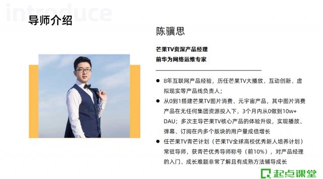 这个教学老师是为了芒果 TV 资深产品经理,前华为网络运维专家 @陈骥思老师,8 一年互联网产品经验,曾任芒果。 TV 广播、互动创新、虚拟现实等产品线负责人;