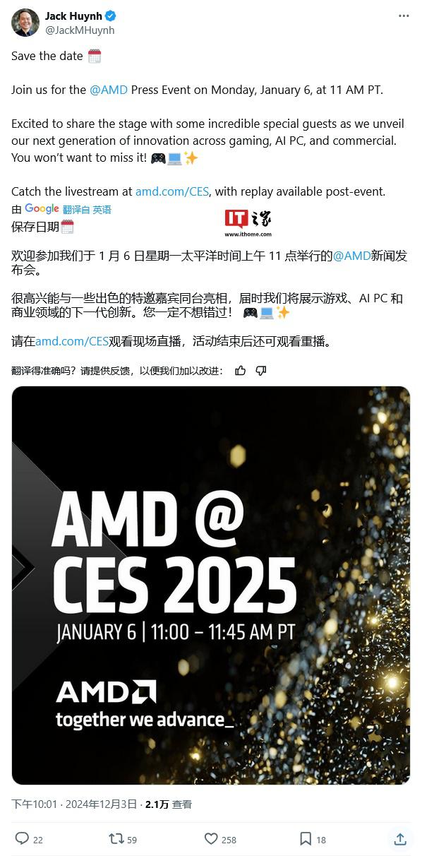 AMD 官宣 CES 2025 新闻发布会将展示“游戏领域下一代创新”