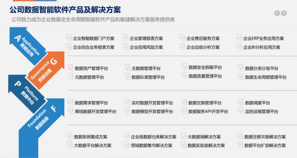 4. 数据应用 ( A-Application ) :A-Application 它是公司基于智能营销、智能风险控制、智能运营等大数据和人工智能研究开发的一系列应用产品。这些产品可以帮助客户挖掘数据价值,提高业务效率和竞争力。