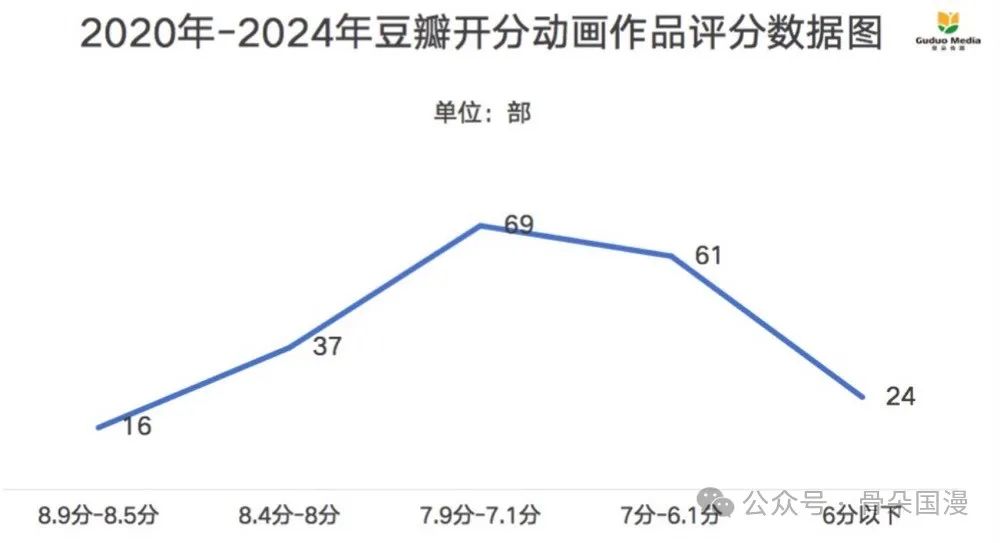 2020-2024年,豆瓣评分8.5-8.9分的作品有16部,8分-8.4分的作品有37部,7.1-7.9分的作品有69部,6.1-7分的作品有61部,6分以下的作品有24部。