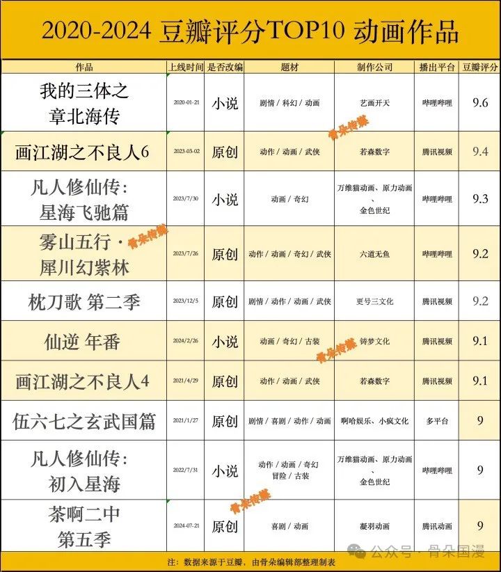 自2020年以来,豆瓣评分最高的作品依然是2020年推出的《我的三体之章北海传》,第二名是2023年推出的《画江湖的坏人6》,第三名是《凡人修仙传:星海飞翔》。