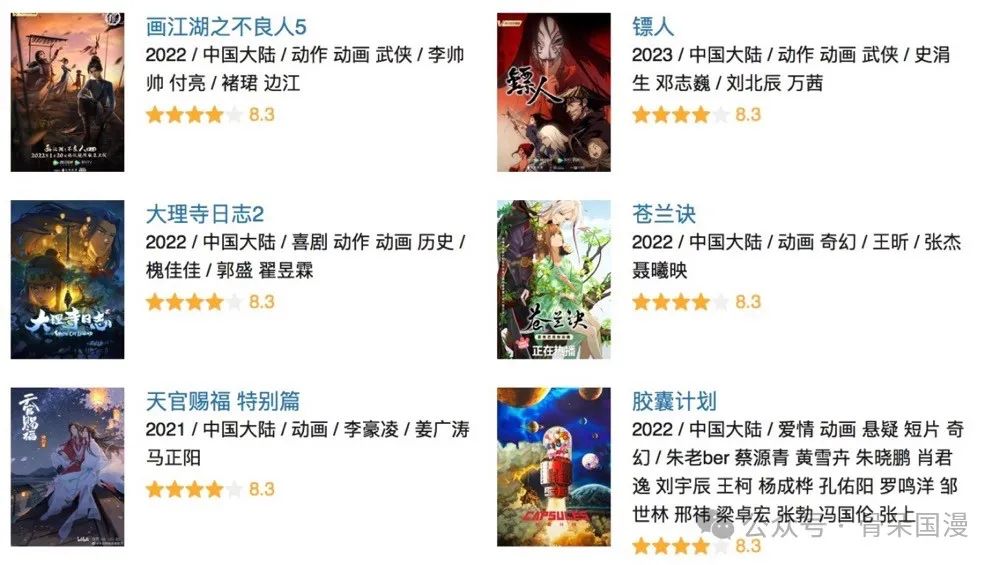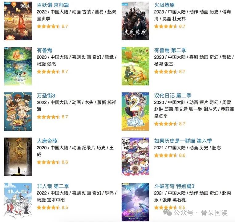 从主题来看,武侠和奇幻依然是豆瓣高分国家中占比最高的。十大中只有《茶二中》是一部喜剧动画,说明武侠和奇幻主题在国家漫画创作中占据主流地位,深受观众喜爱。