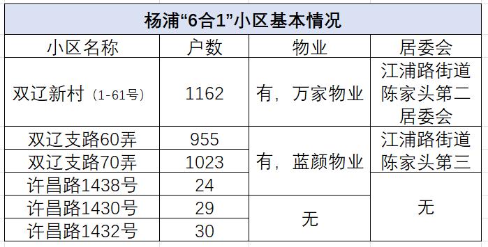 数据显示,杨浦的双辽新村社区建于20世纪70年代和80年代,共有6个居民小区,包括:双辽新村(1-61号)、双辽支路60弄,双辽支路70弄,许昌路1438号,许昌路1430号,许昌路1432号。