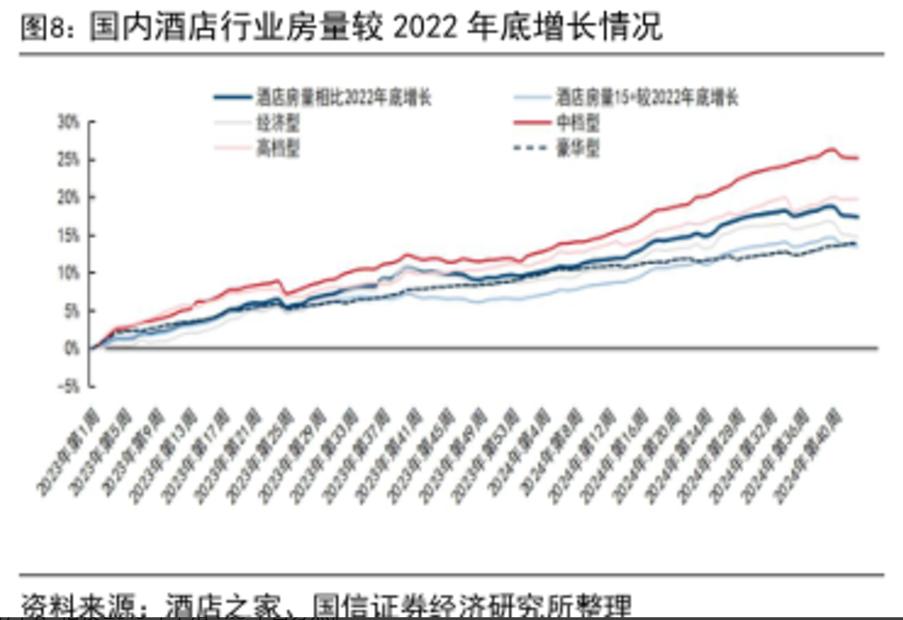 根据中国酒店协会的数据,2024年全国15个房间以上的酒店数量和客房总数同比增长10%和6%,市场总供应量恢复到2019年以前的水平。
