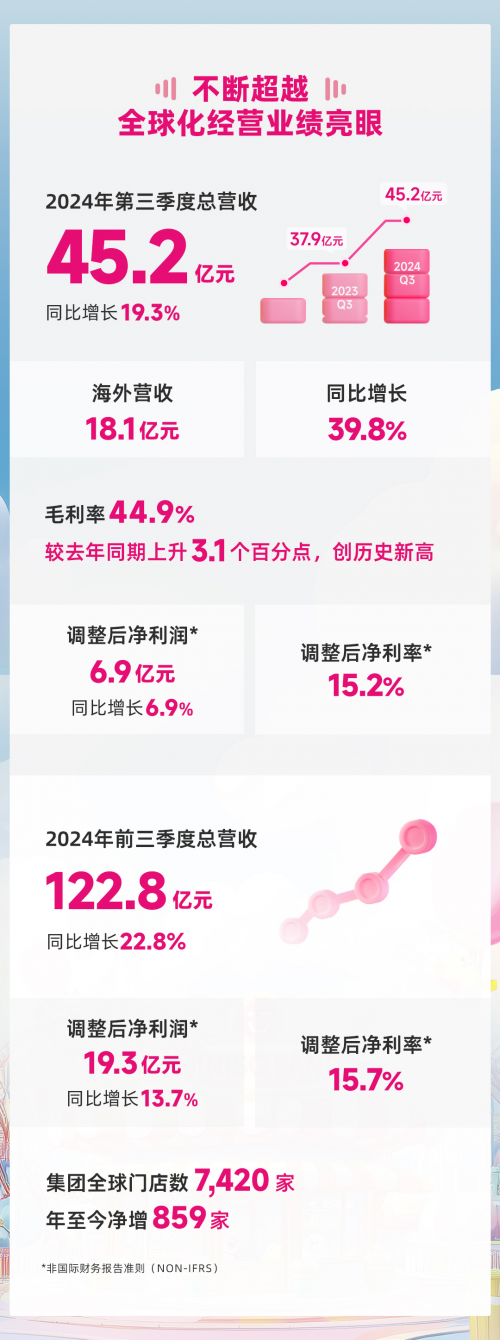 财务报告显示,2024年前三季度名创优品集团业绩发展符合2024-2028年五年规划预期。前三季度,名创优品集团总收入122.8亿元,同比增长22.8%,毛利率同比增长3.7%调整后净利润为19.3亿元,调整后净利率为15.7%,达到44.1%。