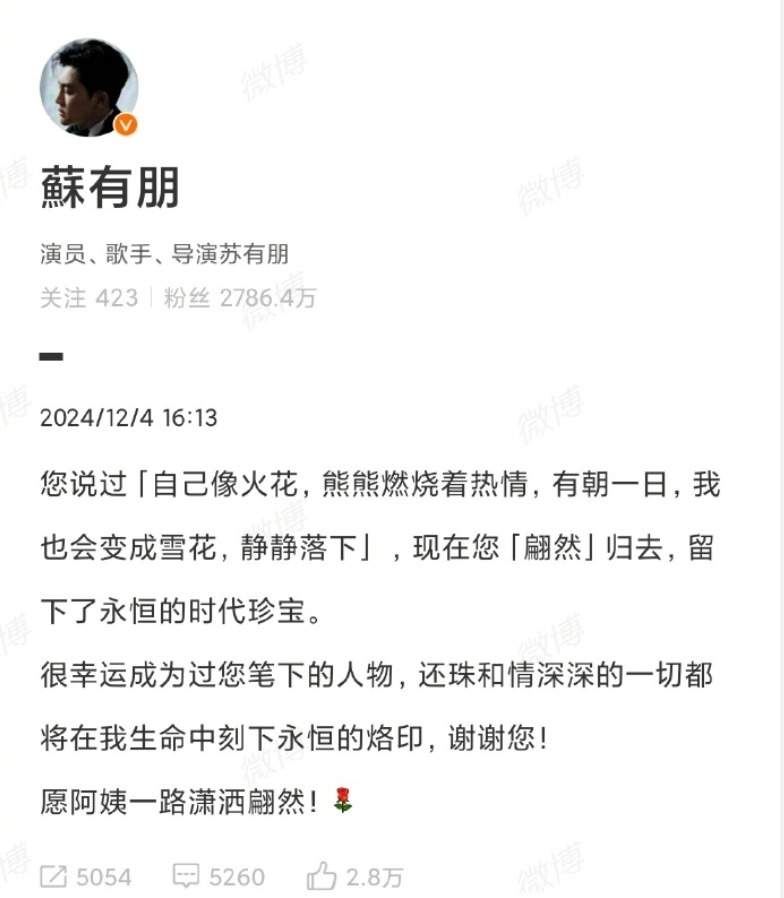 苏有朋也发文悼念琼瑶:“现在您‘翩然’归去,留下了永恒的时代珍宝。很幸运成为过您笔下的人物,‘还珠’和‘情深深’的一切都将在我生命中刻下永恒的烙印,谢谢您!”
