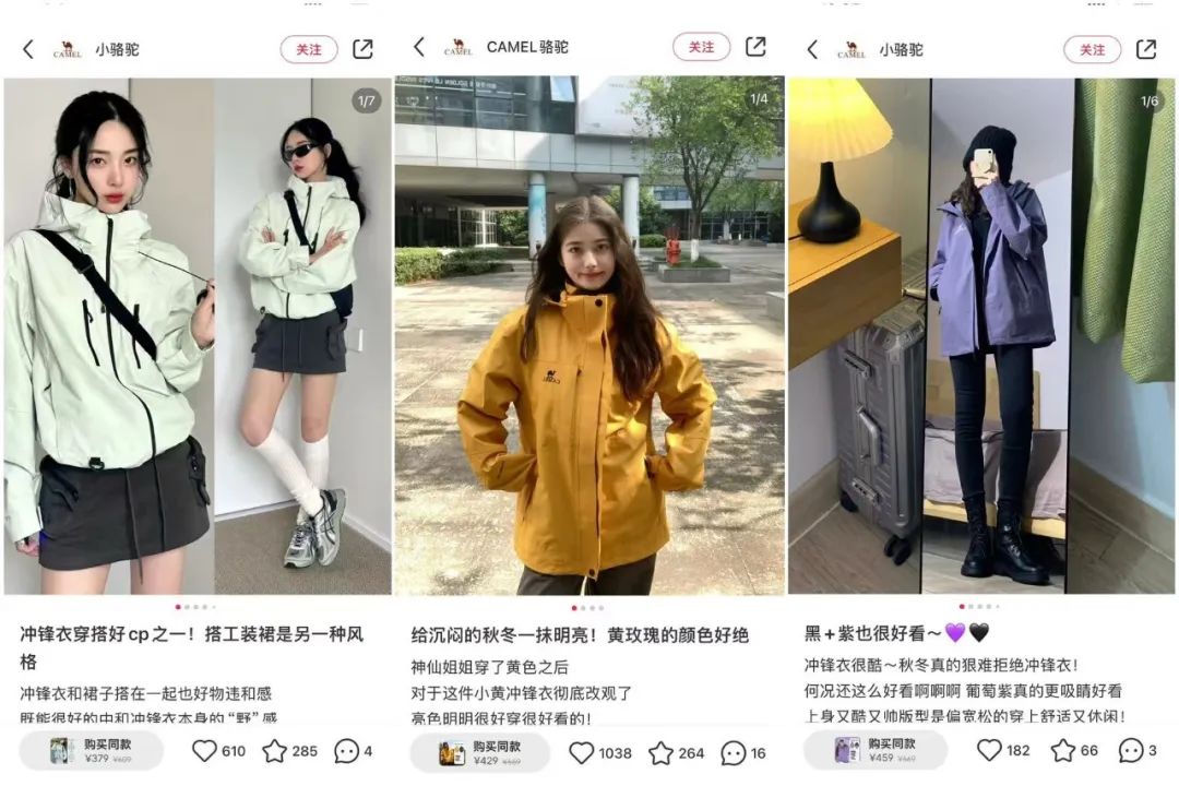 骆驼走近年轻人的第一步,就是改进产品设计,增添了时尚感和活力感的夹克。具体来说,在配色方面,骆驼巧妙地融合了各种高饱和度的颜色和品牌标志性的“驼色”,既保持了品牌特色,又为消费者提供了多样化的选择。在剪裁设计中,保留了调整边缘、可拆卸等基本功能,突出了品牌的户外特色。