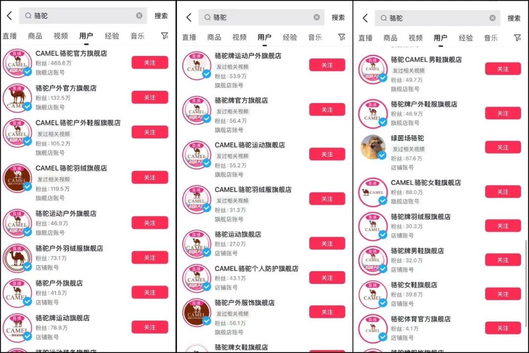 在后端,骆驼设置了大量的矩阵帐户来承接流量。如今去抖音搜索骆驼,可以看到大量名称“相似”的品牌、商家号,这些矩阵号根据账号粉丝画像的不同,配合不同的货盘进行长期直播,完成销售转换,成为骆驼在抖音销售的主阵地。资料显示,骆驼在抖音的总销售额中,品牌和商家自播GMV占73.67%。