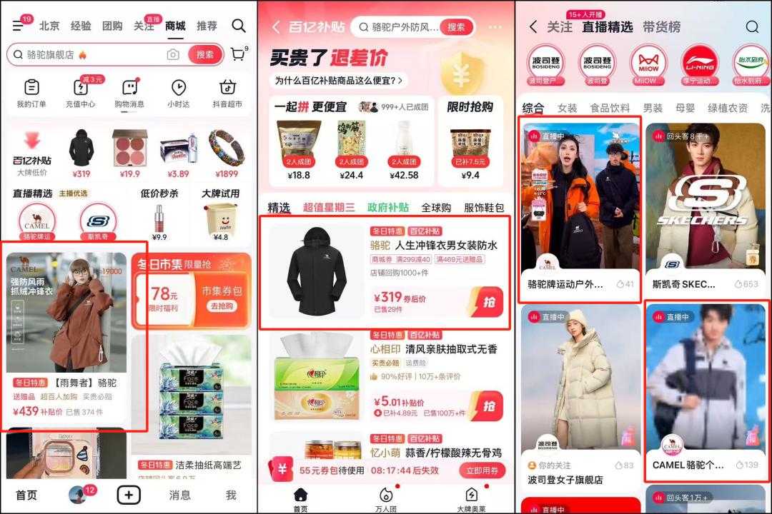 1)抖音货架心智逐步发展,爆款、大链接叠加国产老品牌心智,促使骆驼抓住货架场的增量机会;