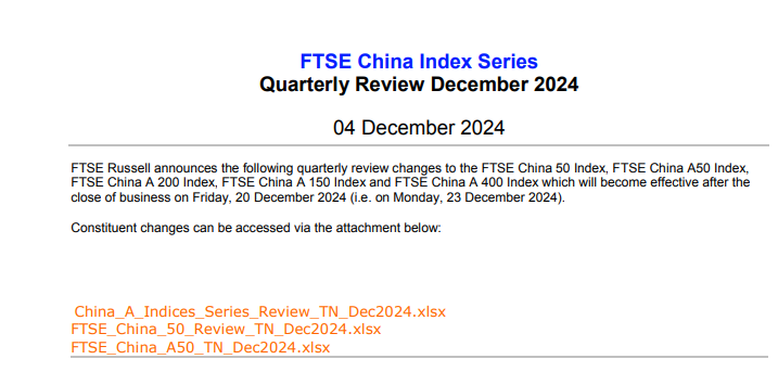 十二月四日盘后,富时罗素宣布对富时中国50指数、富时中国A50指数、富时中国A150指数、富时中国A200指数、富时中国A400指数进行季度审批变更,该变更将于12月20日周五收盘。