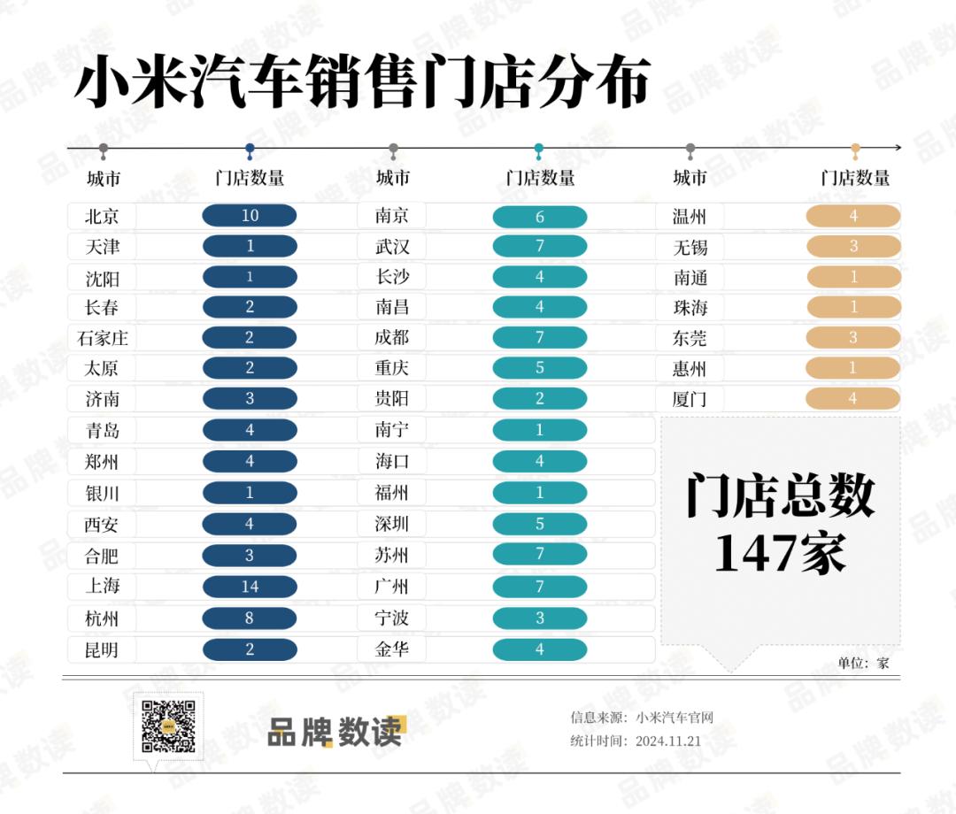 根据小米汽车官网查询统计的最新数据,截至11月21日,中国大陆已有147家小米汽车销售店,两个月内增加了20家。可见小米占领线下门店的决心。