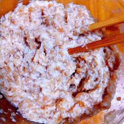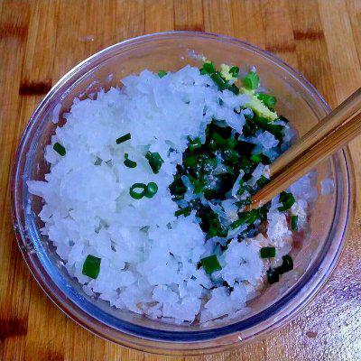 5、将切碎的萝卜、葱花、姜末、盐放入腌制好的肉馅中。