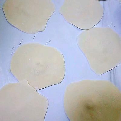 7、取一块擀好的饺子皮,加入适量的萝卜猪肉馅。