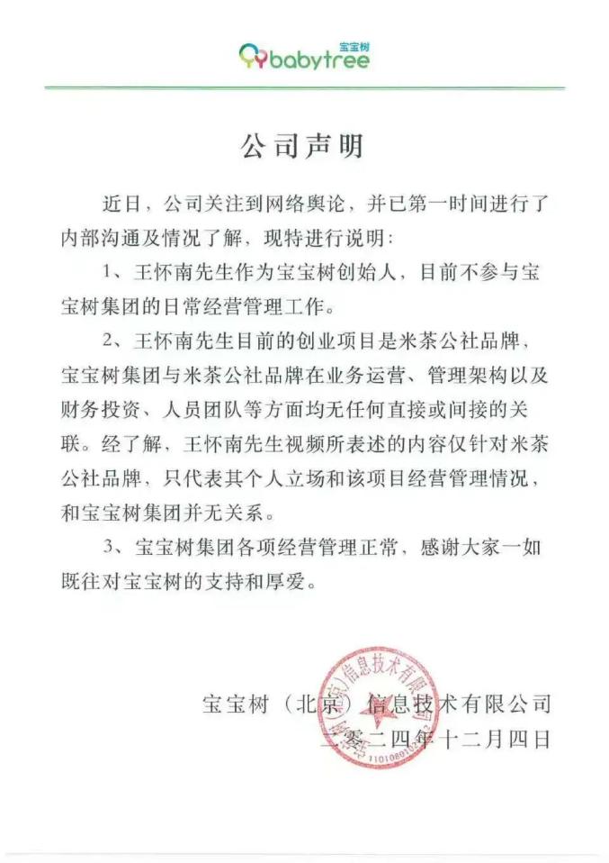 12月4日,宝宝树在其官方微博上也发文回应此事,称创始人王怀南目前不参与宝宝树集团的日常管理。他目前的创业项目是米茶公社品牌,宝宝树集团和米茶公社产品在业务运营、管理结构、财务投资、人员团队等方面没有直接或间接的联系。