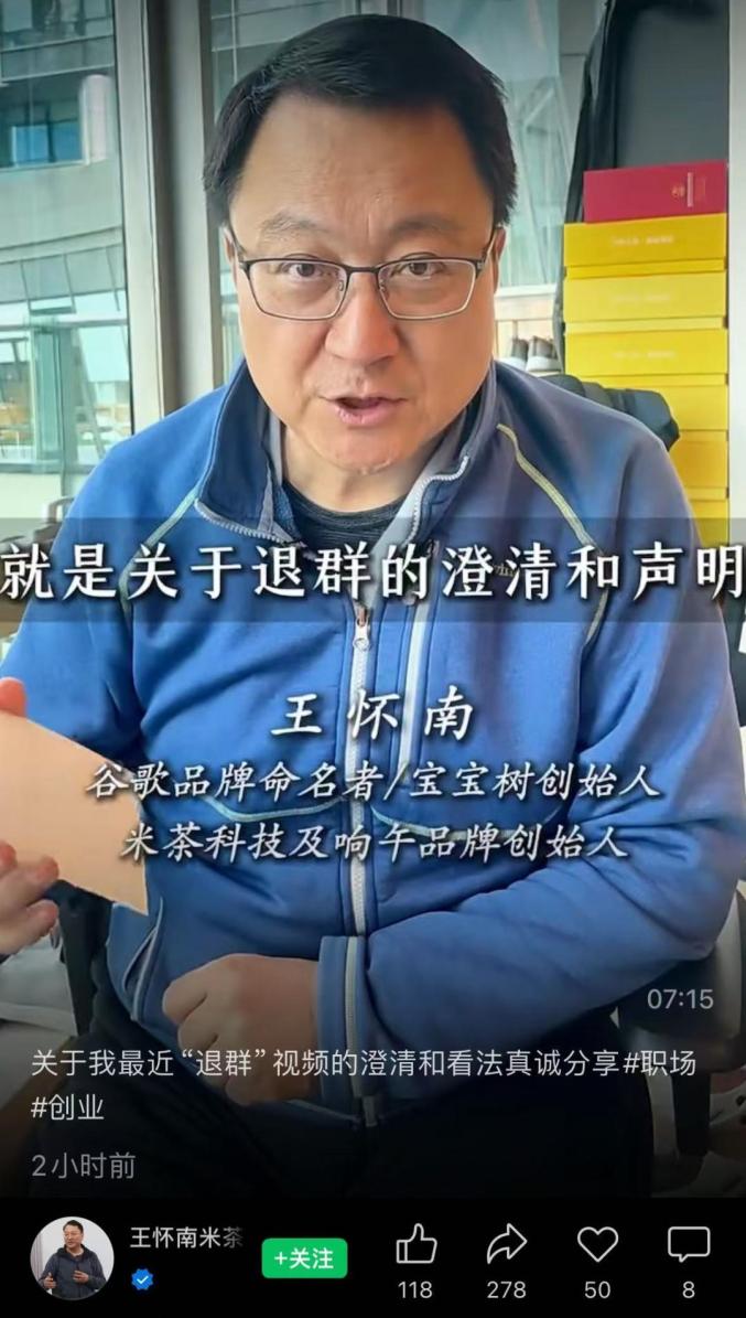 12月4日,宝贝树和米茶科技创始人王怀南在“王怀南米茶公社宝贝树”视频号上发布视频,回应“退出员工群”事件。王怀南说:“首先,这件事与宝贝树无关。我已经好几年没有经营宝贝树了。第二,宝贝树和新品牌没有裁员措施。”