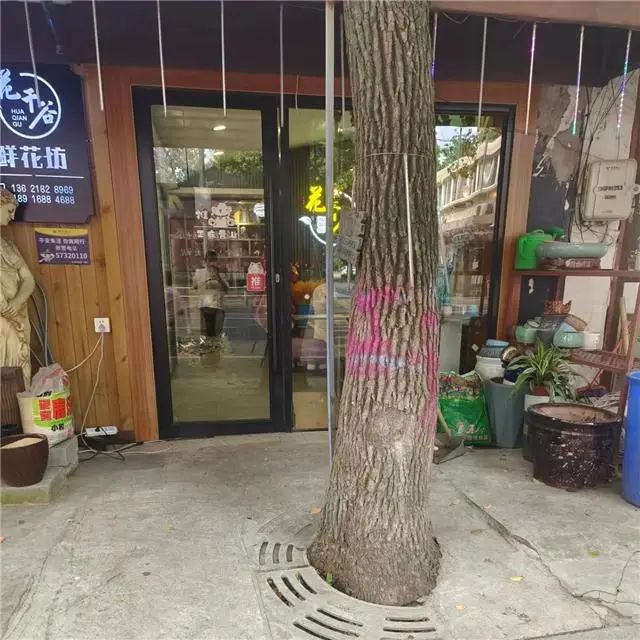 西林街区党支部在收到胡女士的报告后迅速响应,工作人员立即前往花店核实情况。他们发现,这棵高约15米的樟树不仅阻碍了商店的正常营业,而且地下生长蔓延的树根也导致商店入口处道路凹凸不平,影响了交通安全。