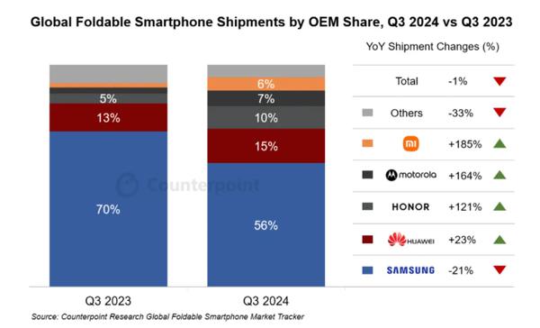 值得注意的是,根据 Counterpoint Research 2024年最新市场跟踪报告 2008年第三季度,全球折叠屏智能手机市场首次遭受历史下滑,出货量同比下降 1%。虽然中国手机制造商如华为、荣耀、小米、摩托罗拉等仍在高速增长,但折叠手机的整体市场环境更加严峻。