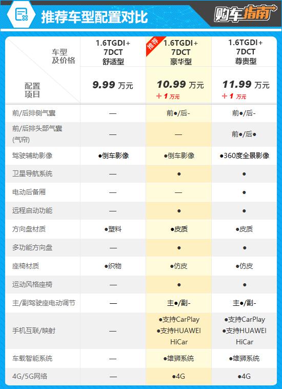 参考价为 10.99 万元的 1.6TGDI 7DCT 豪华版是这次推荐的车型。通过配置对比可以看出,与入门级车型相比,推荐车型增强了仿皮材料座椅、主驾驶座电动调节、皮革材料多功能方向盘,可以有效提高日常车辆的舒适性和便利性。并且汽车配备了雄狮系统,内置 4G 互联网,手机互联网 / 投影等,更符合当前消费者对汽车的需求。另外,推荐车型还增加了前侧气囊,进一步提高了安全驾驶水平。而且价格只比入门版多出来。 10000 人民币,绝对物超所值,性价比极佳。