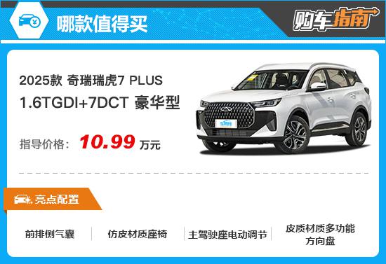 因此,对于 2025 款瑞虎 7 PLUS 消费建议,重点推荐参考价格为 10.99 万元的 1.6TGDI 7DCT 豪华版,消费者在购买时可以优先选择。