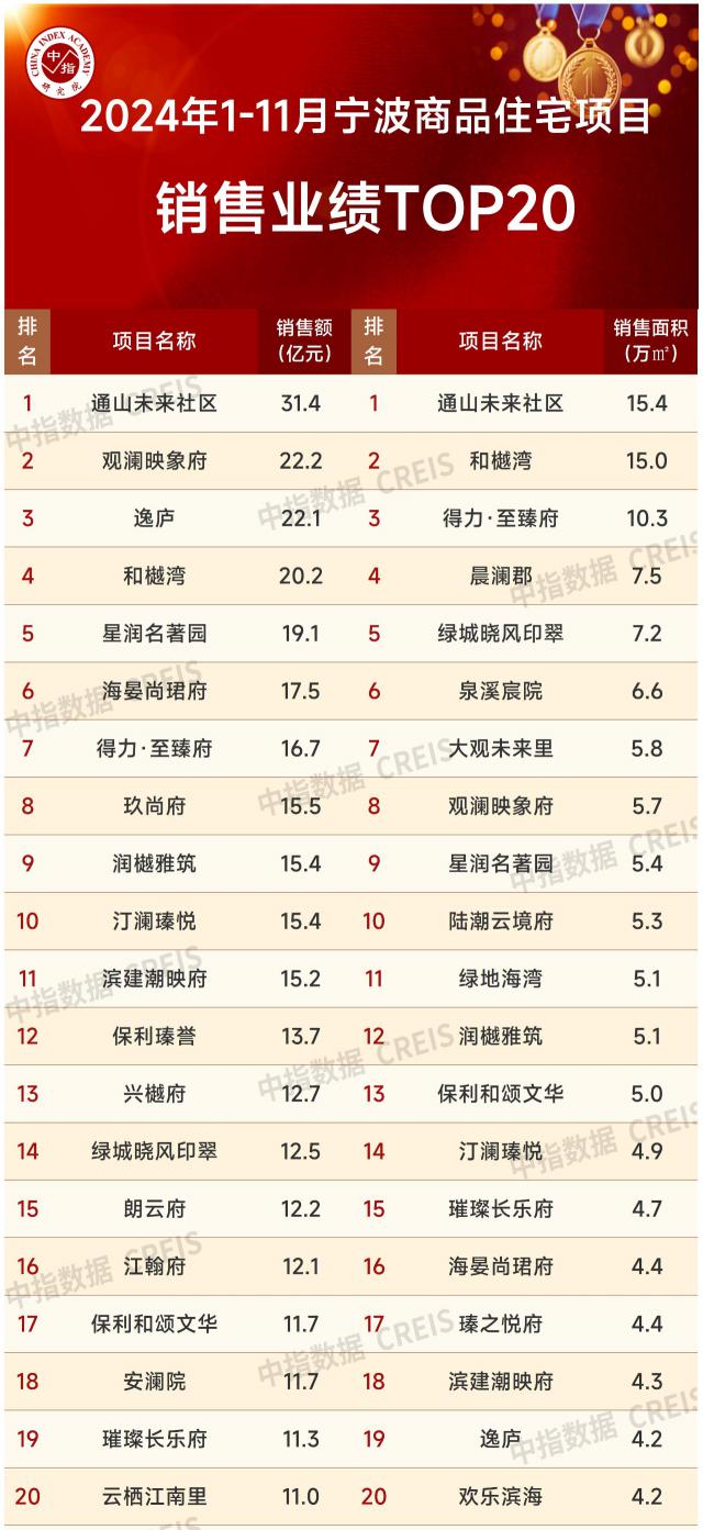根据商品房销售额排行榜,2024 年 1-11 月份,宁波商品房销售额排行榜 TOP20 该项目的总销售额为 319.55 亿元,平均值为 15.98 1亿元,商品房销售额排行榜门槛 10.95 1亿元。TOP20 该项目的总销售面积为 130.55 万㎡,平均值为 6.53 万㎡。