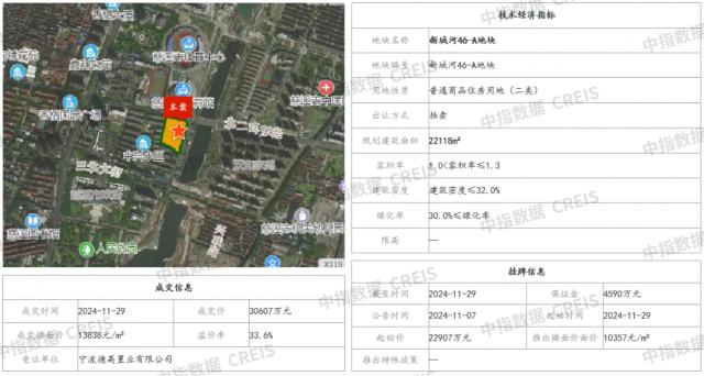 2024 年 11 月 , 宁波成交楼板均价为 1603 元 /㎡,平均溢价率为 0%; 住宅用地转让金达 1.37 亿元。