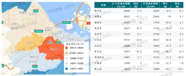 2024 年 1-11 月宁波商品房(不含保障房)分区域成交均价状况