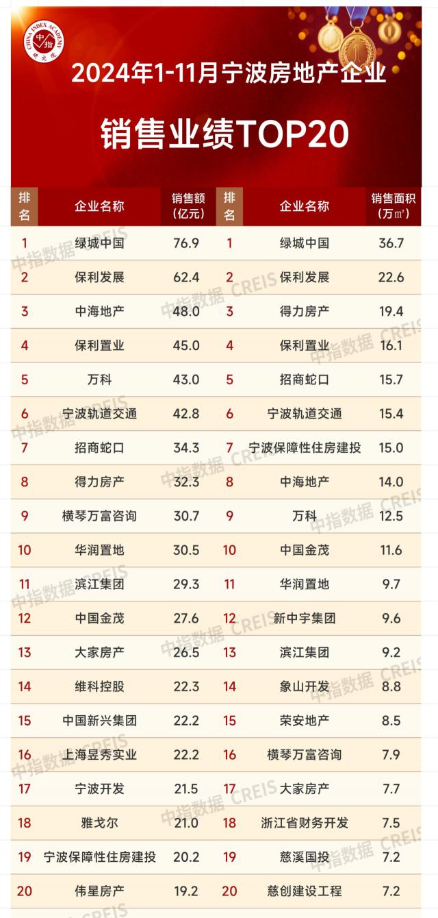 宁波房地产公司2024年1-11月销售业绩排行榜