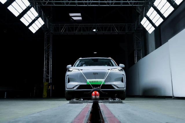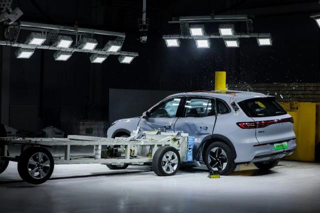 吉利银河在整车高速刮底试验中 E5 以 35km/h 测试速度,超过国家标准要求的速度 30km/h,冲击能量增加 36% 以上。