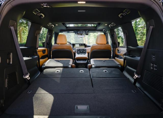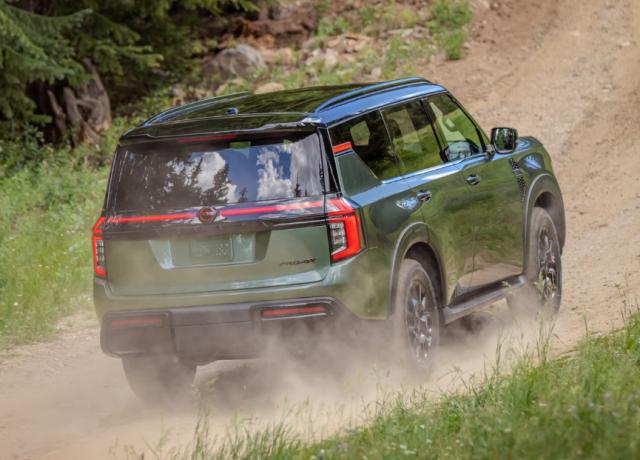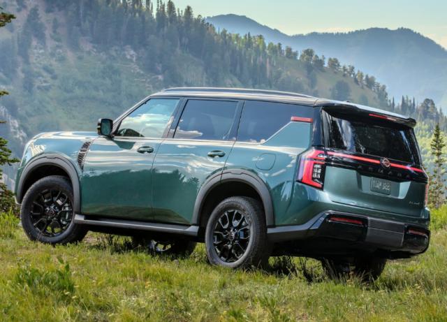 大型新车定位 SUV,整个侧面非常魁梧,看上去充满了体量感。采用悬挂式车顶设计,Pro-4X 版配置 20 全地形轮胎,进一步提高非铺路时的越野能力。尾部提供尾翼,配有贯穿式尾灯组,两侧 C 字形灯光造型也与车前相呼应,配有熏黑车标。 logo 而且英文字标,有很好的体量感。