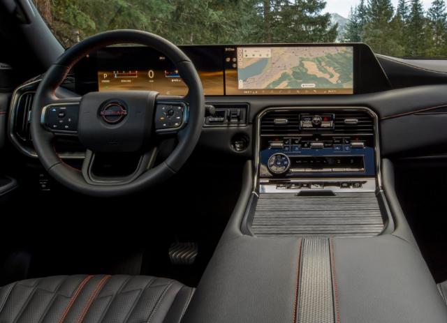 内饰部分,提供双重 14.3 英寸双屏布局(英菲尼迪) QX80 同样的型号),但是布置在这样宽敞的车厢里,的确也不显大。车内包裹着大量的软质材料,