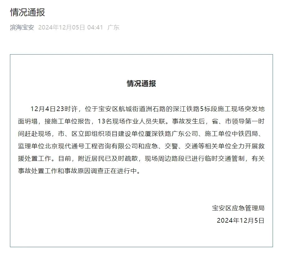 据新华社消息,深圳市宝安区应急管理局5日通报,4日23时许,位于宝安区航城街道洲石路的深江铁路5标段施工现场突然地面坍塌。根据施工企业的报告,13名现场工人失去了联系。