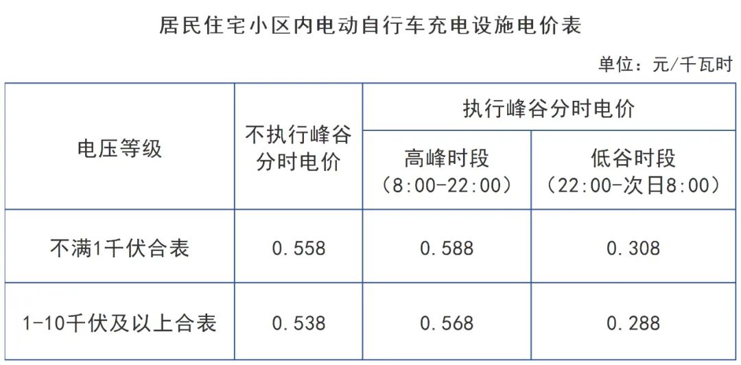 住宅小区电动自行车充电设施用电,电网企业、物业单位、充电设施运营单位、客户等环节的主体应当按照居民合表客户的电费收取充电电费,安装主体可以自愿申请峰谷分时电价,选定后12个月内一致。