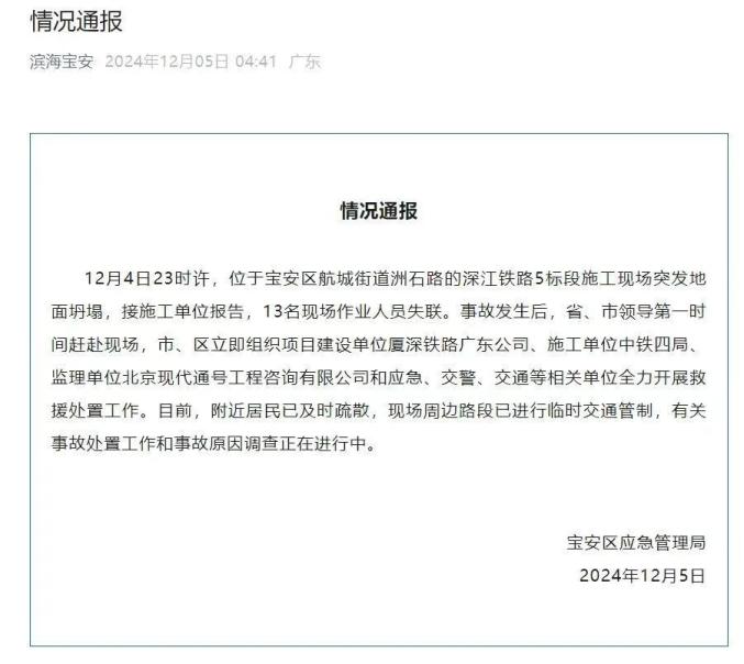 12月4日23时许,位于宝安区航城街洲石路的深江铁路5标段施工现场突然地面坍塌。根据施工企业的报告,13名现场工人失去了联系。事故发生后,省市领导立即赶赴现场,市、区立即组织项目建设单位厦深铁路广东公司、施工单位中铁四局、北京现代通号工程咨询有限公司、应急、交警、交通等相关单位全力开展救援处置。现在,附近的居民已经及时疏散,现场周围的道路已经进行了临时交通管制,正在进行相关事故处理和事故原因调查。