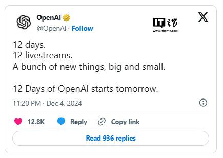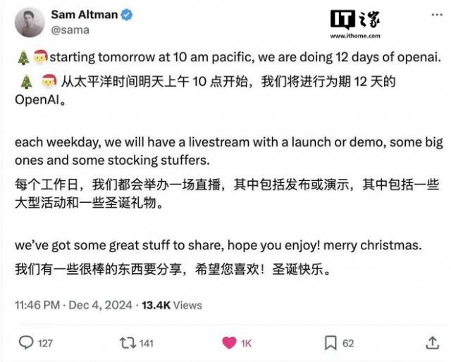 IT 世家 12 月 5 每日报告,当地时间 12 月 4 日,OpenAI CEO 在社交媒体上,阿尔特曼透露,接下来的每一个工作日都会有直播,总共 12 现场直播,包括发布或演示,包括一些大型活动和一些圣诞礼物。