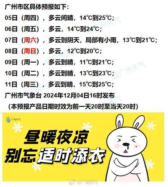 周末两天(7-8 日本),受冷空气扩散和高空波动的影响,广州云量增加,日平均气温下降,但昼夜温差仍较大,大家小心感冒。