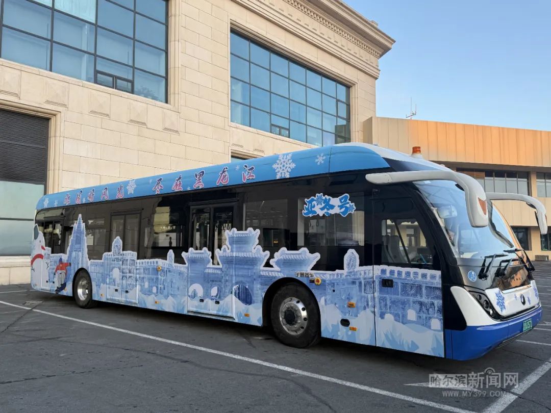 亚冬号摆渡车的车身以浅蓝色为主,代表着哈尔滨冬天碧空如洗的天空,与洁白无瑕的冰雪相得益彰。