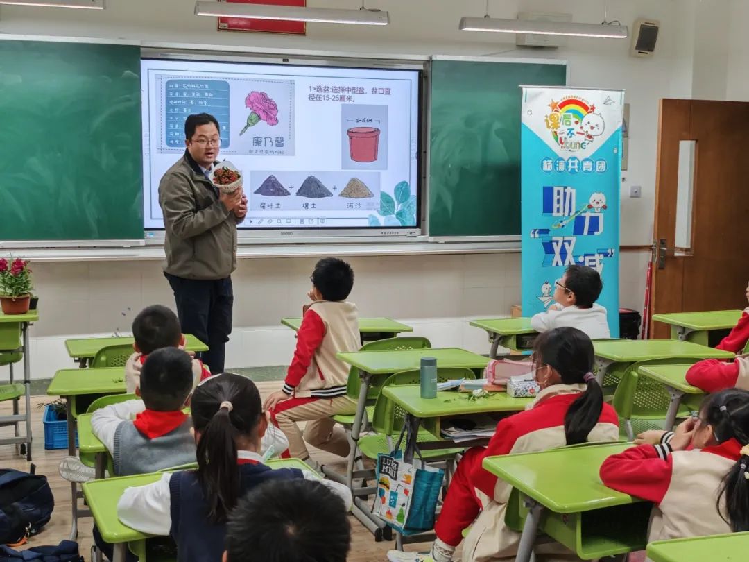 近日,上海杨浦园林建设养护有限公司工作人员来到打虎山路第一小学,在“课后YOUNG”课堂上普及养花知识,为校园课后服务增添了清新的绿色。让学生亲近自然,了解园林艺术,在校园里营造浓厚的绿色文化氛围。