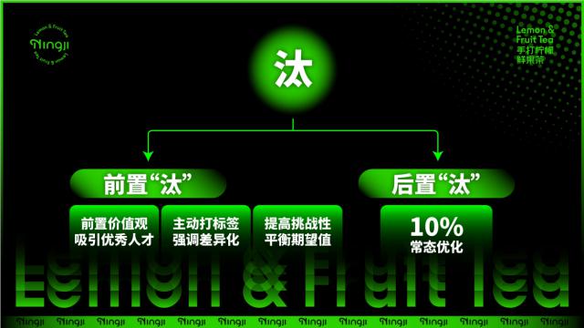“淘汰”分为外部“淘汰”和后置“淘汰”。为什么一定要把价值观放在第一位?这是一个主动贴标签的过程。柠檬季节是追求卓越和成就导向。如果你想从九点到五点平躺下来,你肯定进不了柠檬公司,或者进了就很难生存。另一个是后置的“淘汰”——离职率。柠季从来不建议企业保持低离职率。一个创业公司必须有一个高度淘汰和主动优化的过程,否则人才无法沉淀。