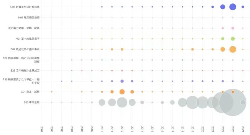 拆解团队今年九月使用Patententent来检索专利信息 Field,从2004年到2024年的20年间,根据IPC(国际专利分类),对中国吉利控股集团的相关专利进行了分析,该集团旗下的专利数量直接凸显了近年来技术能力的快速发展。
