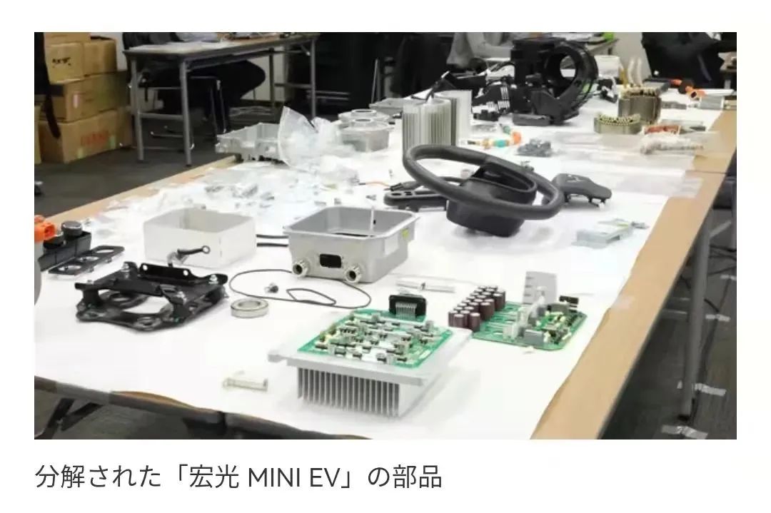 追溯到2021年,日本NHK电视台特别报道了这款车的爆红情况。名古屋大学的山本真义教授公开拆解了一辆宏光MINIEV,试图揭示这款车热销背后的低成本秘密,包括媒体,共有100多人观看了现场。