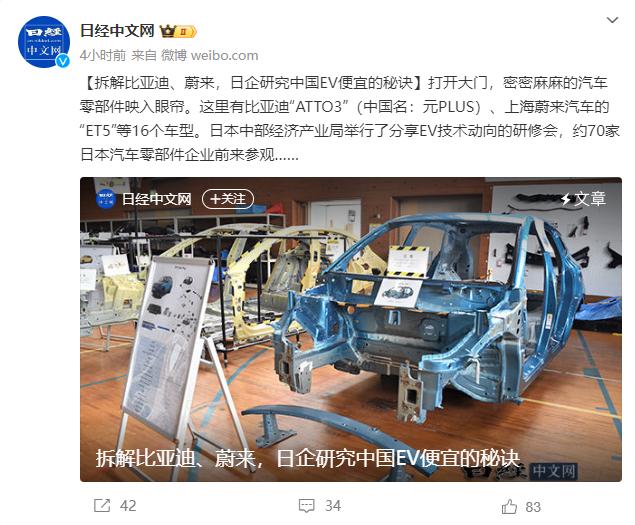 今年,在日本经济产业局的一次电动汽车研讨会上,70家日本汽车零部件公司走访了拆解展示,深入探讨了中国电动汽车的车身结构和零部件特点。