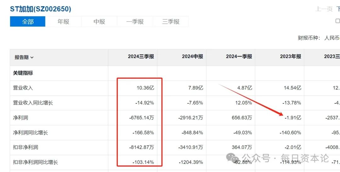 ST加加的财务报告显示,自2012年上市以来,其收入已达16亿元,此后多年来,利润一直处于这一水平。虽然,在2019年和2020年,ST加加收入超过20亿元之后,它继续下滑。净利更是连续三年亏损,2021-2023年累计亏损超过3.5亿元。到2024年第三季度,ST加加收入达到10.36亿元,同比下降14.92%。;净利润损失6765.14万元,比去年同期下降166.58%。