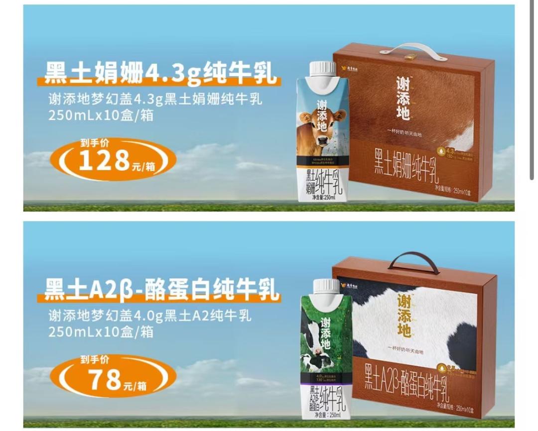 现在,“谢添地”推出了两款常温白奶产品:梦幻盖黑土娟纯牛奶,官网商城售价128元/盒(250mlx10盒);梦盖黑土A2纯牛奶,价格为78元/盒(250mlx10盒),即每瓶价格分别为7.8元和12.8元。
