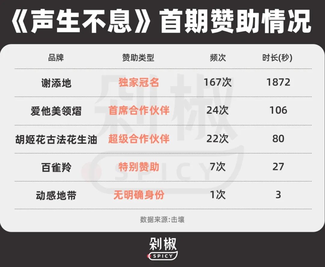 很多品牌很早就进入市场,享受市场红利。据剁椒统计,节目播出时,获得了五个品牌的合作,分别是谢添地、爱他美、胡姬花、百雀羚和动感地带。其中,冠名赞助商为“谢添地”,也被网友评为最冷门的广告主。
