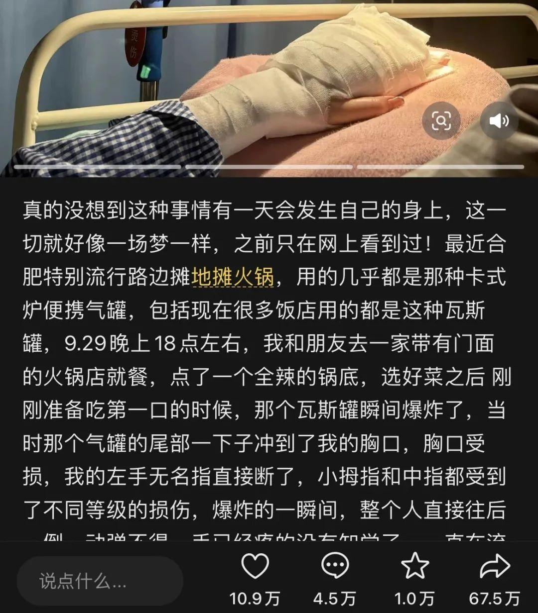 也有网友在网上爆料,由于卡式炉的安全问题,自己在吃地摊火锅时,遇到爆炸,人身安全受到伤害。