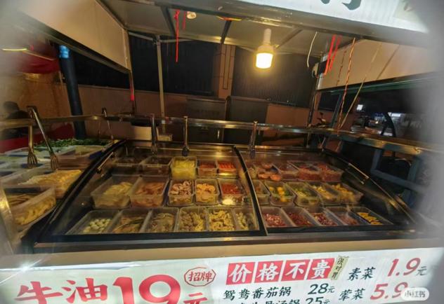 根据你的亲身经历,这种摊位火锅的配置基本一样:锅底19元,荤菜5.9元/两,素菜1.9元/两。三轮车上有各种各样的食材,标明价格。旁边有几张桌子,有的放着调料餐具,有的放在手术台上。