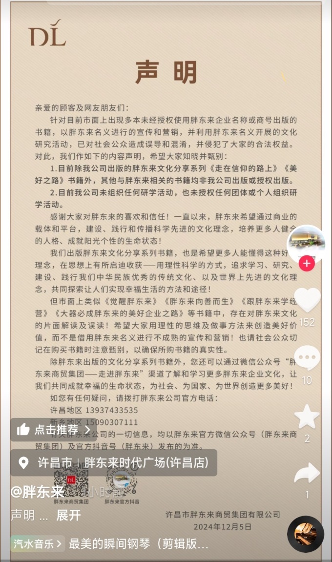 12月5日,胖东来发表声明称,市场上出现了许多未经授权使用胖东来企业名称或商号出版的书籍,以胖东来名义进行宣传和营销,以胖东来名义实施的文化研究活动,误导和混淆了公众,侵犯了每个人的合法权益。