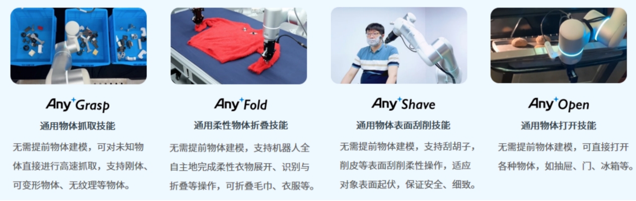 在产品方面,穹彻智能不仅提供了一个软硬兼施的大脑系统,还推出了AnySkill通用技能系列产品,可以适应各种智能平台。目前可以实现抓取、折叠、刮削、打开四大技能。
